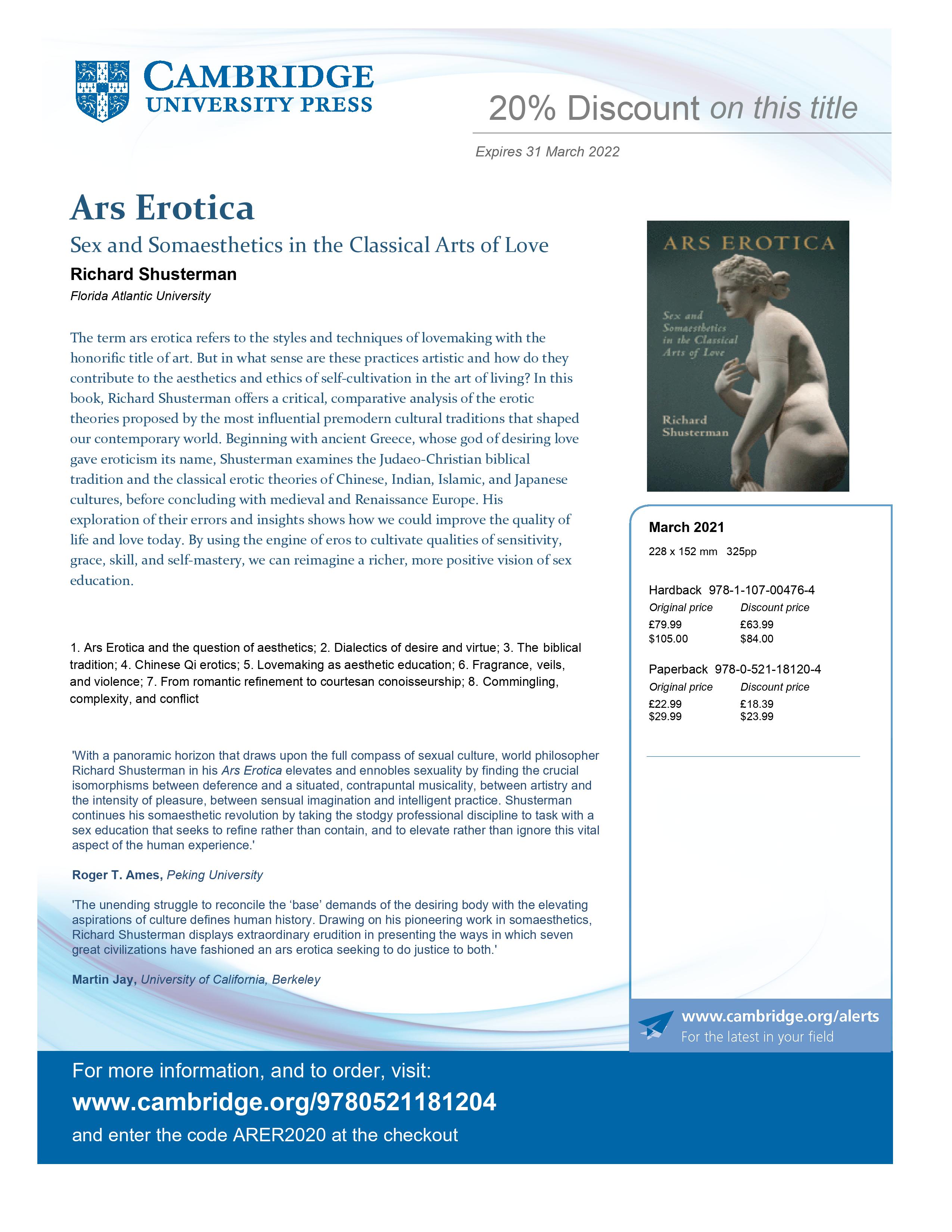 To recieve a discount onArs Erotica: Sex and Somaestheticsplease click here or see the disconted flyer below.