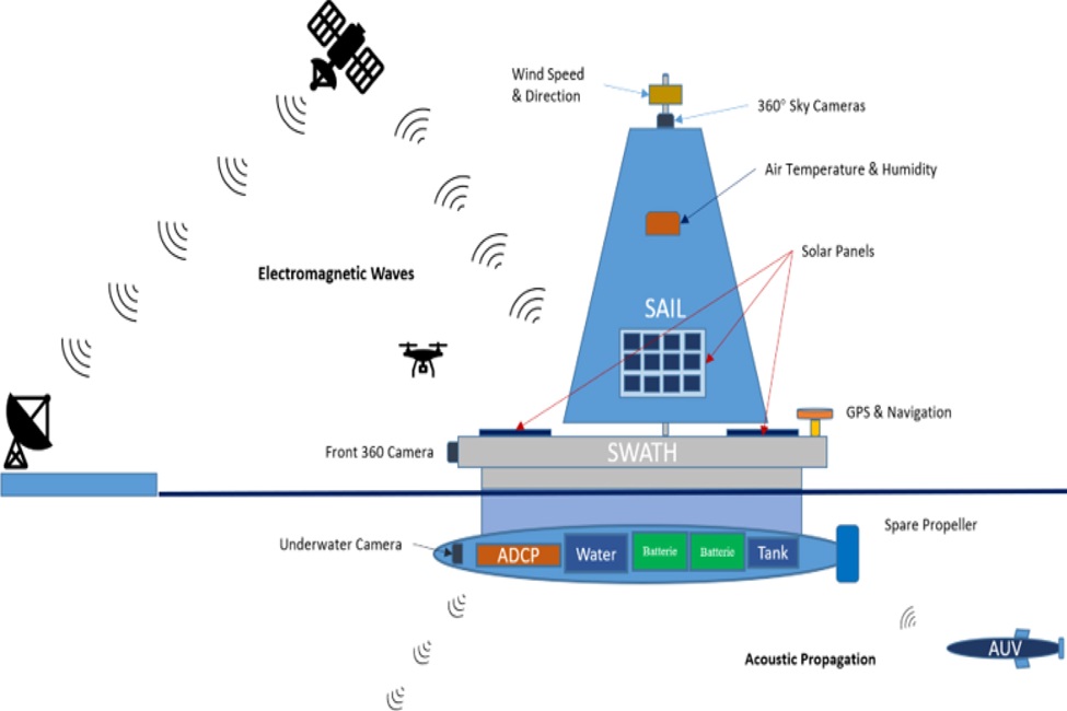 Their conceptual design features a small waterplane area twin hull (SWATH) vessel that acts as a docking and charging station for AUVs and unmanned aerial vehicles (UAVs). The SWATH ship is engineered for exceptional stability, allowing it to navigate through melting ice and operate in a wide range of sea conditions. It is designed to be self-sufficient, utilizing automated sailing, solar panels and an underwater turbine positioned between its twin hulls to generate and store energy, ensuring continuous mission support even when sailing against ocean currents.
